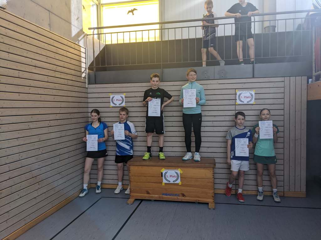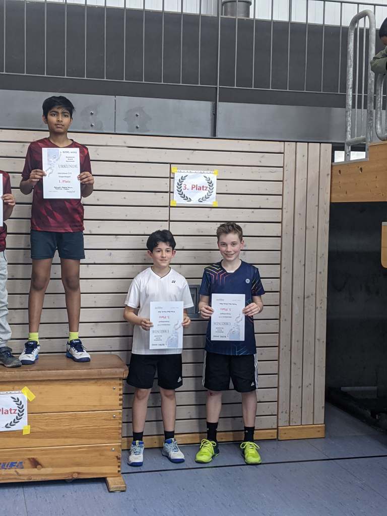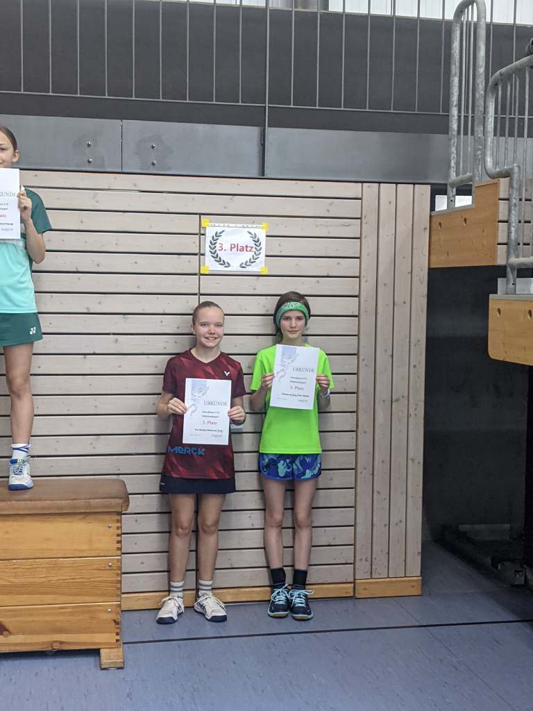 Zum Abschluss des Turnierwochenendes standen die Doppel auf dem Programm. Leonas Steiner und Advit Sharma (1. Wiesbadener BC)setzten sich in der 5er Gruppe ohne Satzverlust durch und erzielten den ersten Platz. Felix Jung und Jakob Schmidt (1. BV Bamberg) folgten direkt dahinter. Moritz Reil und Elias Rais (TV Wicker) sicherten sich nach anfänglichen Schwierigkeiten in ihrem ersten gemeinsamen Turnierspiel einen guten dritten Platz nach einem Drei-Satz-Spiel um Platz 3. Katharina Jung und Kim Streiber (BV Darmstadt) erreichten am Ende ebenfalls den dritten Platz, nachdem sie ihr Spiel knapp in zwei Sätzen verloren. Ayla Roy und Sophia Gabriel traten in einer starken Gruppe an und belegten mit einem Sieg den vierten Platz.