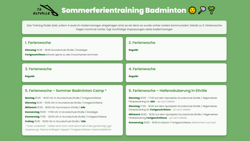 Hier die Trainingszeiten in den Sommerferien, kurzfristige Anpassungen folgen eventuell noch. Wünsche euch allen schöne und erholsame Ferien! Freue mich, wenn ich den ein oder anderen von euch in der Halle sehe! Kommt gesund und gut erholt zurück!🌴
